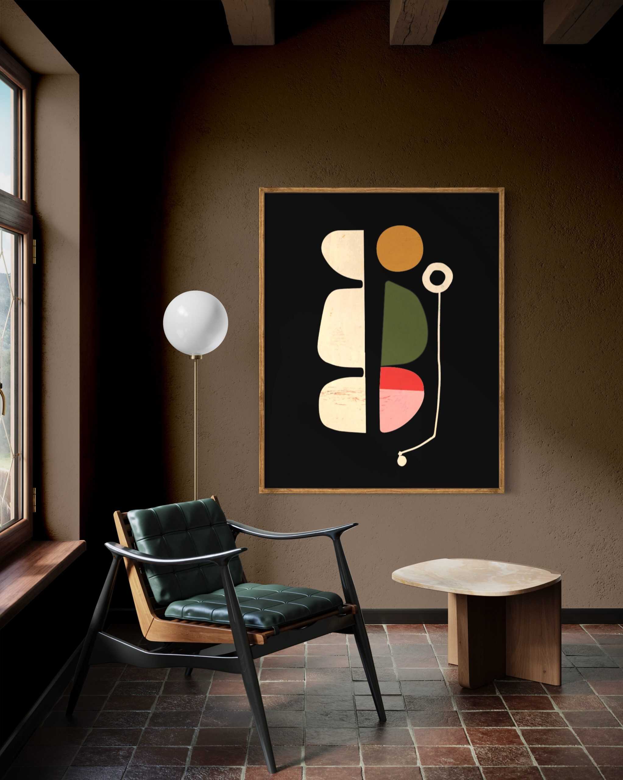 Ajoutez une touche de modernité à votre intérieur avec cette œuvre d’art abstraite. La composition joue avec des formes organiques et géométriques sur un fond noir profond. Des aplats de couleurs sourdes – crème, vert olive, et un rose corail – créent un équilibre visuel. Un cercle jaune et une ligne fluide complètent le design, apportant une dynamique subtile.